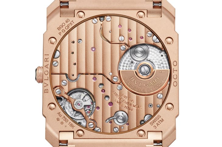 ▲Octo Finissimo Perpetual Calendar採用喷砂玫瑰金材质与超薄表壳结构,结合万年历复杂功能,呈现优雅现代的单色金属美学。