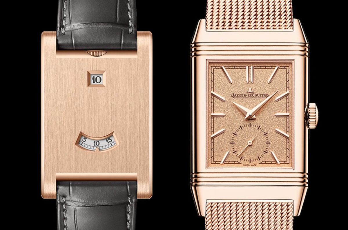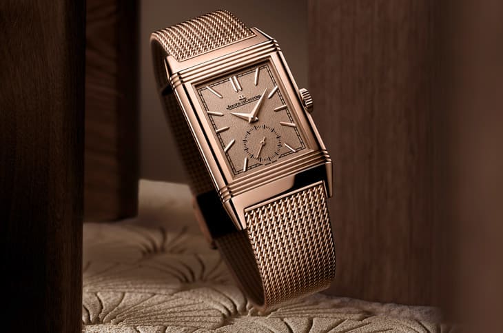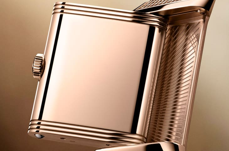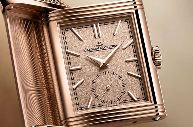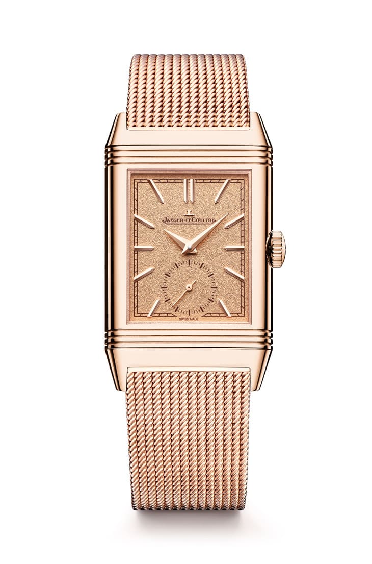 ▲玫瑰金表壳搭配粒纹金色面盘与小秒盘,设计简约优雅,翻转背面可客制装饰,展现经典Reverso风格。