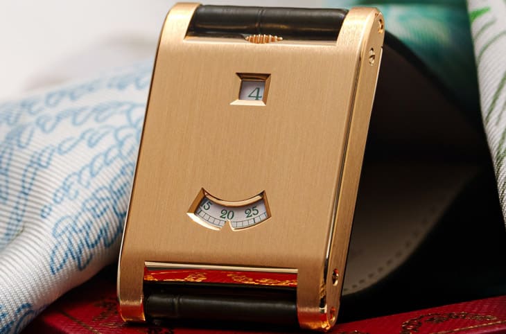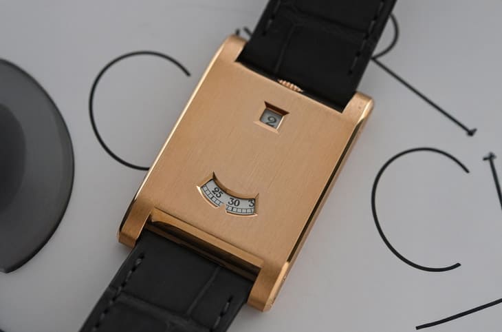▲手表无传统面盘,以12点跳时与6点拖曳分钟视窗显时,深灰数字与金色粒面外观融合出复古且未来感兼具的风格。Source:ablogtowatch