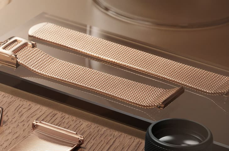 这款Reverso新作的最大亮点,玫瑰金米兰链带绝对当仁不让。这条链带被公认是让手表整体设计大幅升级的关键要素。它由两条玫瑰金金线交错编织而成,细致密实的结构灵感来自中古时期的锁子甲,打造出柔软贴肤如布料般的佩戴感,积家甚至以义大利语"Pezza"称之,意指「布料」,可见积家对这条链带的高度重视。当编织完成后,每枚链节都经过精准冲压、拋光与手工焊接,制作过程繁复,但成果惊人:不仅表面平滑、手感细腻,更能完美贴合手腕,带来超越皮革与传统金属链带的舒适体验。由于链带本身具有一定重量与延展性,能自然地平衡表壳重量,让整体佩戴更稳定,表耳也经过重新设计,让链带与表壳之间无缝衔接,而且链带配有滑动式可调节表扣,无论手围粗细皆可调整,满足个人佩戴需求。