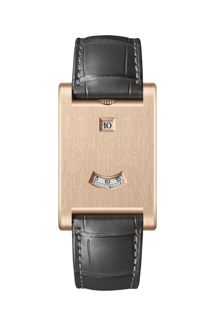 此款表最迷人之处,就是它彻底摒弃传统面盘与指针,以两个视窗掌握整个时间语言,这种设计源于Art Deco时代对简约与功能性的极致追求,也反映出卡地亚对机械工艺品的重塑能力。12点钟方向的小矩形视窗以跳时显示,数字每小时瞬跳,6点钟的半圆形视窗则显示分钟刻度,採用拖曳式指示方式,一枚小小金色箭头指标搭配缓缓移动的转盘指示分钟,画面极富节奏感与未来感。手表正面的玫瑰金拉丝表面上仅见两处「开窗」,这种设计既保有坚固感,又充满艺术性,小时与分钟盘下方採用金色微粒面质感材质,搭配深灰色阿拉伯数字与分钟刻度,辨识度高,也与表带色调呼应。此外,视窗边缘的倒角经过细腻拋光,为整体增添一丝温润细节,手表搭配深灰鱷鱼皮表带,风格优雅中带着一丝机械冷感。唯一须注意的是,由于显示窗相对迷你,若在光线不足处可能需多花一点时间阅读时间。