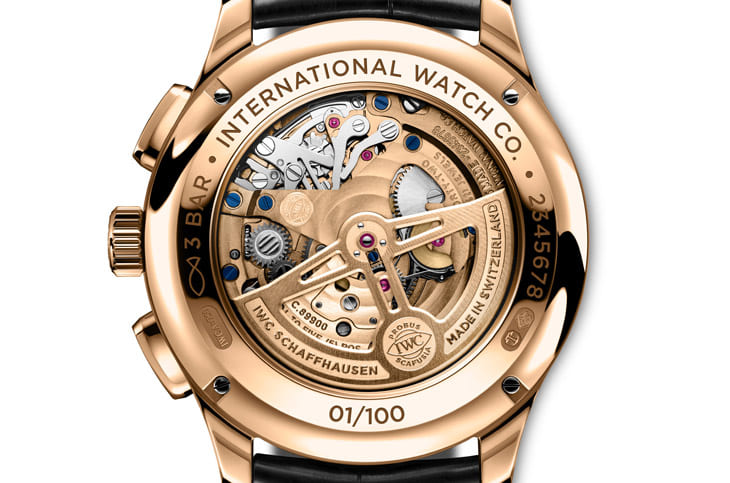 陀飞轮位于面盘6点钟方向,是整只表的视觉核心,其由56枚零件组成,重量不到1克,却能每分钟旋转一圈,有效抵消地心引力对走时准度的影响。IWC更为这枚陀飞轮配置了停秒装置,可精准对时到时间最小单位,并採用硅材质搭配自家专利Diamond Shell®涂层,进一步减少摩擦、提升能效。另一项特色是9点钟方向的逆跳日期,透过扇形刻度指示1到31日,每到月末便俐落地「跳」回起点,读时方式独特且具有动感;最后则是12点钟方向的时、分同轴计时盘,具备飞返功能,按下一键即可让计时归零重启,使用体验上相当直觉、流畅。