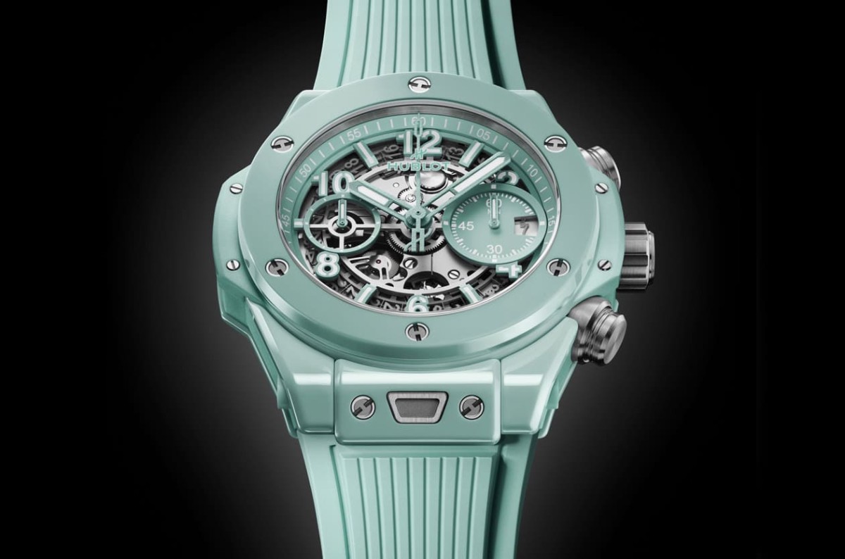 ▲「薄荷绿」陶瓷表壳色泽明亮清新,搭配同色系细节与表带,展现夏日活力与时尚感,突显宇舶对色彩掌握的前卫实力。