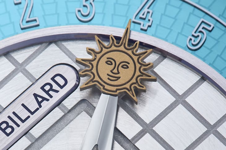 SB06表壳採用五级钛合金打造,直径41mm、厚度仅9.5mm,搭配双弧形蓝宝石镜面,佩戴手感轻盈且视觉立体,设计概念则围绕「日月交替」概念,双尖时针一端为金质太阳,另一端为夜光涂层银色月亮,呼应亚洲文化中阴阳和谐、天地轮转的哲学;更特别的是,SB06的24小时指示功能,成为市场上少见结合飞行陀飞轮与全日制时间显示的作品。