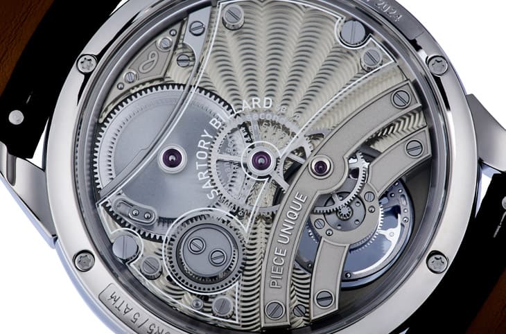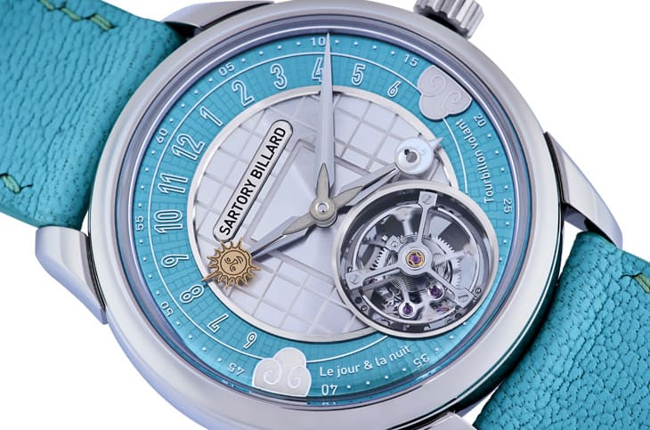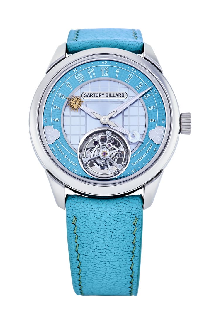 这系列手表搭载SARTORY BILLARD自制SBTV01手上链机芯,不仅动力储存达96小时,更以隐形蓝宝石桥板营造出飞行陀飞轮悬浮于空中的视觉错觉。每枚机芯皆由209枚零件组成,包含三颗特大红宝石点缀机芯视觉,也提供深度藏家极具「玩味」的放大细节赏析。