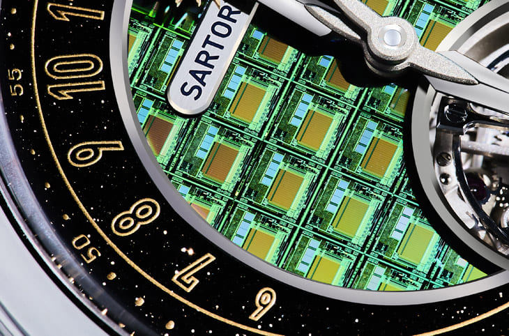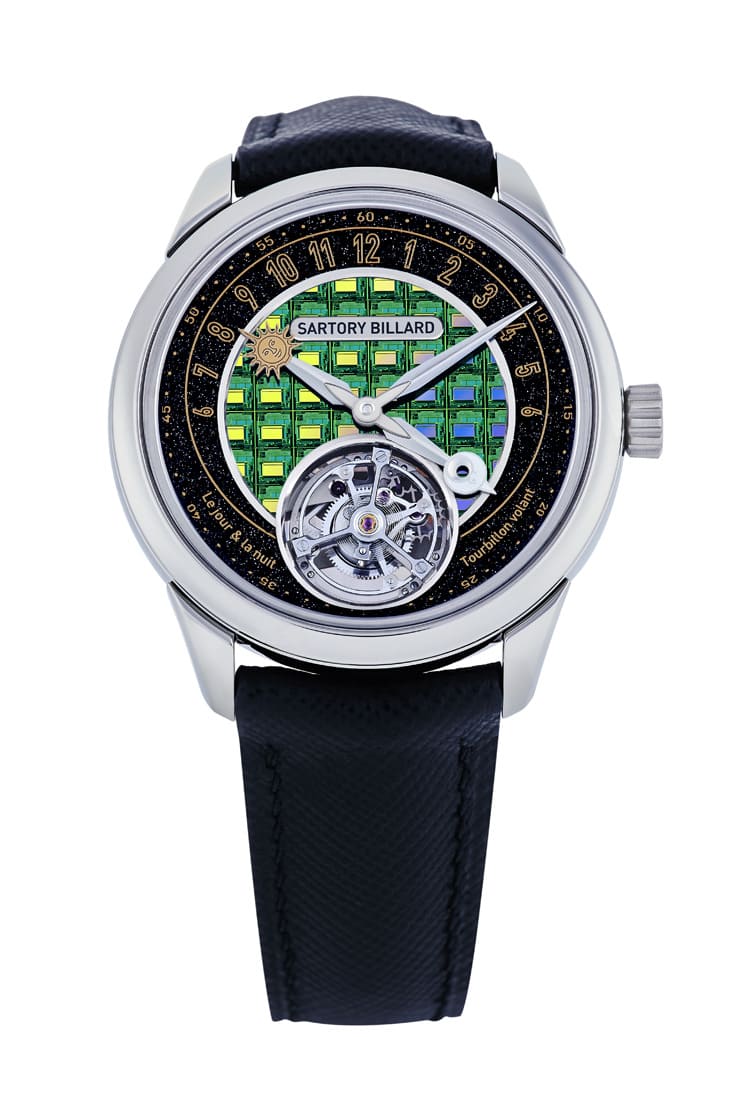 本次SARTORY BILLARD x SHH联名共推出八款SB06飞行陀飞轮,各自代表新加坡、马来西亚、泰国与台湾四地城市意象,每款皆为全球唯一,其中台湾款在本地市场无疑最具话题,这款Spirit of 101 SHH Edition,将台北 101的建筑轮廓镂刻于透明蓝宝石面盘,宛如云端摩天楼漂浮于腕间;而Silicon Constellation SHH Edition 更把硅晶圆镶嵌进面盘中心位置,映照出台湾作为全球半导体重镇的关键角色,并以黑色砂金石象徵星河,交织出台湾的科技轨跡与人文浪漫。