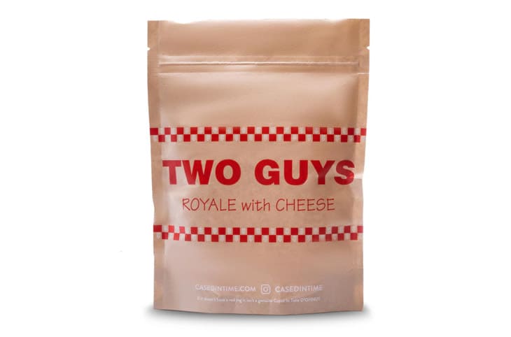 ▲表盒包裹铝箔、搭纸袋风格外盒,印有Two Guys标志,视觉宛如真汉堡外带餐,极具趣味沉浸感。Source:Time+Tide