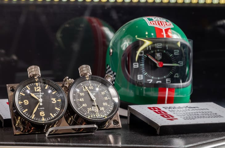▲典藏展区展出洗拿曾佩戴的S/EL手表(上)与Cavallino头盔座钟(下)等历史珍品,见证泰格豪雅与法拉利、传奇车手的深厚渊源,传递品牌竞速精神与历史。