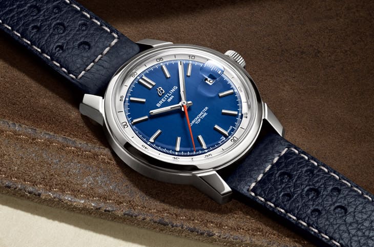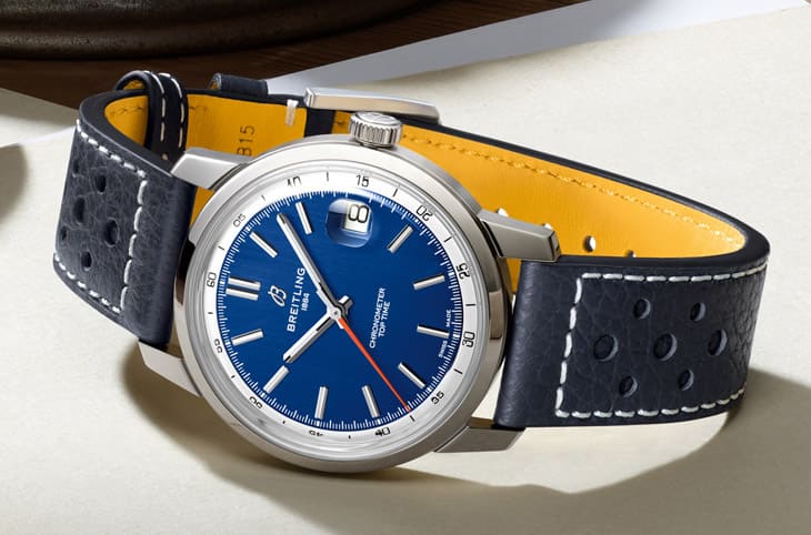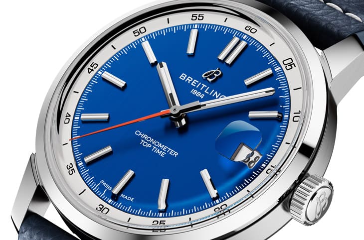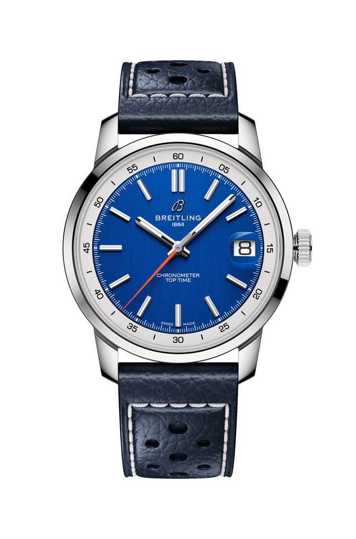此款式中的蓝面最大亮点之一,就是它那显眼却不抢戏的顏色,这种蓝不是那种海军蓝的沉稳老派,也不是鲜亮蓝的年轻浮夸,而是介于两者之间的饱和深蓝,带有一种令人沉静的质感。面盘中央为纯蓝色调,外圈则是对比强烈的白色刻度环,整体呈现出一种速度感十足的双色布局,令人联想到复古汽车仪表板的设计。而为了让视觉焦点更鲜明,B31在中央秒针大范围用了亮橘色涂装,这枚指针看起来就像仪表板上的红线指针,悄悄呼应了Top Time的赛车灵魂,3点钟方向配有放大日期窗,搭配白底黑字的日期盘,视认性一流;值得一提的是,这款蓝面版本搭配的是略深一阶的深蓝色皮革表带,并不是与面盘同色,反而营造出层次感,让整体配色显得更成熟、耐看。