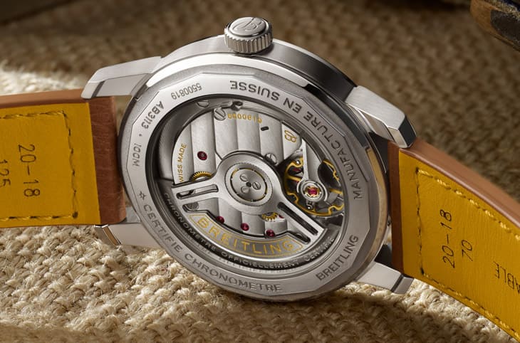 手表内部搭载了百年灵最新的技术心臟——B31机芯,这是他们首次专为三针表打造的自制机芯,据知是与Sellita旗下AMT部门合作研发,花了四年时间才正式问世。B31自动机芯拥有非常实用的78小时动力储存,震频为4Hz,日常佩戴精准稳定,并通过COSC天文台认证,精准度维持在每日-4~+6秒范围内。透过蓝宝石透明底盖,可以清楚看到内部组件运作与作工,举凡日内瓦波纹、鱼鳞纹打磨、镂空自动盘一应俱全,虽说机芯装饰不若高级机芯那麼华丽,但作为日常用表,它已提供足够的美感与可靠性,而且这枚机芯经过严格的耐用性测试,包括模拟16年的每日佩戴、数百万次的自动盘旋转与上链测试,还有高达500G的冲击耐受性,诚意十足,对一只主打设计与生活风格的手表来说,能兼具这样的品质实属难得。