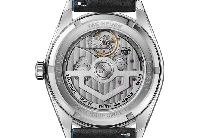 Carrera Day-Date系列搭载的TH31-02机芯,那麼巧也是泰格豪雅与Sellita旗下高阶部门AMT合作研发、专为泰格豪雅独家生产的自动上链机芯。这枚机芯的最大亮点之一是高达80小时的动力储存,对于平日上班、假日不戴表的族群来说,是相当贴心的设计,而4Hz震频也确保了走时稳定且精准,无需过多调校即可长期维持时间精度。透明底盖下能一睹其镂空盾形自动盘的风采,此设计不只点亮机芯视觉造型,也与TAG HEUER的盾形Logo呼应。底盖边缘有一枚小小的月桂花环雕刻,是向Carrera赛道血统致敬的细节安排,赋予这款非计时款码表更多历史与精神层次。虽然这枚TH31-02机芯并未取得COSC天文台认证,但其实际表现仍非常可靠,而且品牌为搭载该机芯的表款提供五年延长保固,可见对其品质有十足信心。