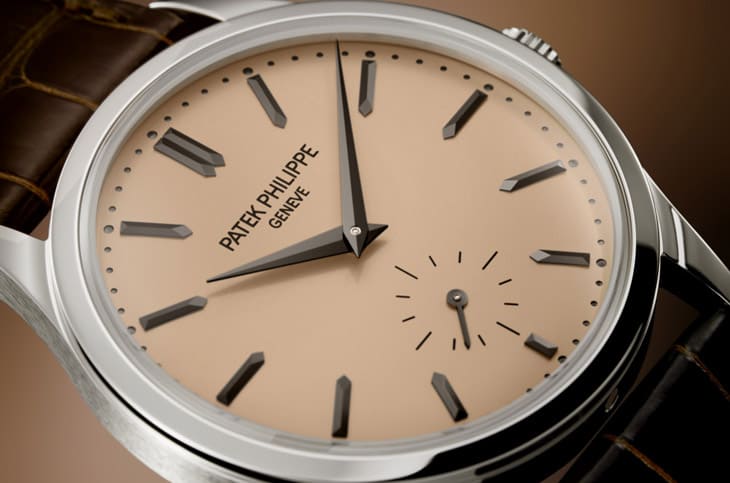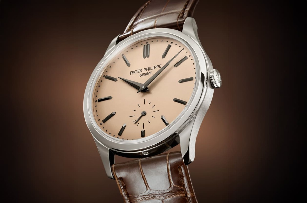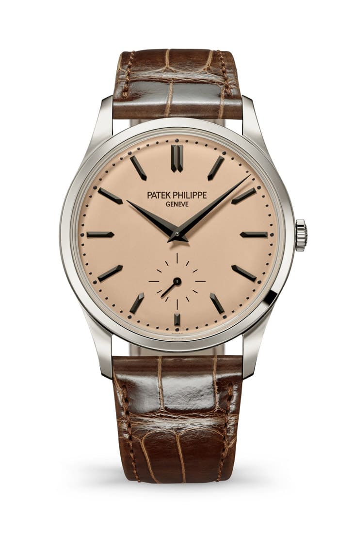 6196P的面盘是被称为Rose-gilt Opaline的面盘,散发出一种近似「鮭鱼色」的温暖调性,它不是夸张的橘粉色,也不走时下流行的复古高饱和,而是一种经过调和与打磨的色彩,既柔和又含蓄。面盘的雾面处理如同细致的粉状粒子,在不同光线下展现微妙变化,它不是「一看就惊艳」的类型,而是需要时间去细细体会的美感。至于时标与指针採用白金打造,表面经过刻面切割与拋光,色泽略带炭灰色调,与温润的鮭鱼色面盘形成冷暖对比,不仅提升了可读性,更增添了一丝当代感。6点钟方向的小秒针盘,是手表最令人欣慰的细节之一,因为过去5196的机芯太小,小秒针盘位置偏上,显得有些「失重」,而这次换上PP新世代机芯后,小秒针终于被放在「该在的位置」,面盘的视觉平衡瞬间提升,视线所及,散发一种对比例与布局执着的职人魂美感。