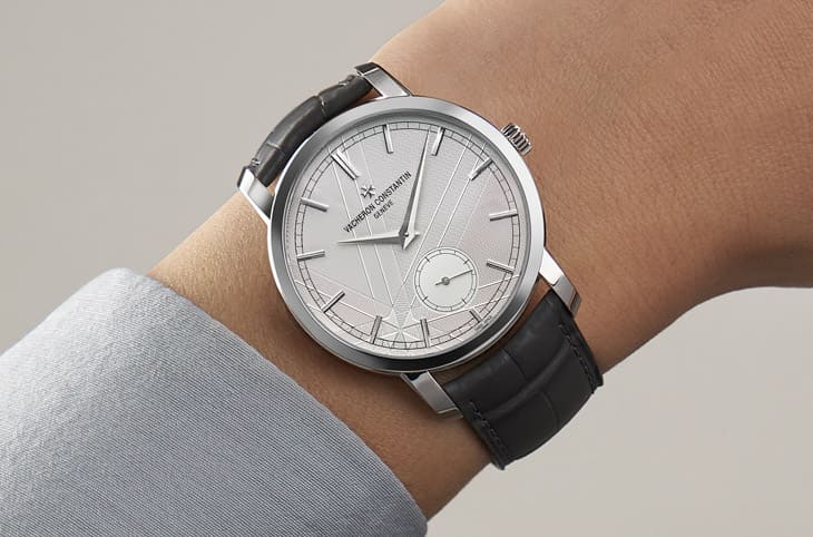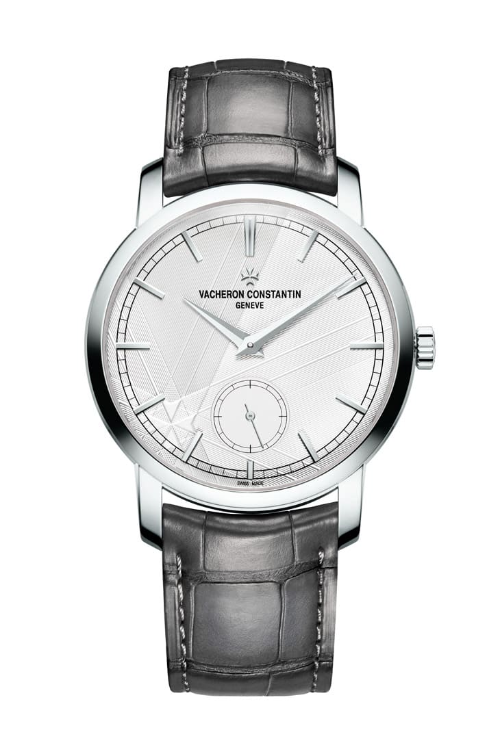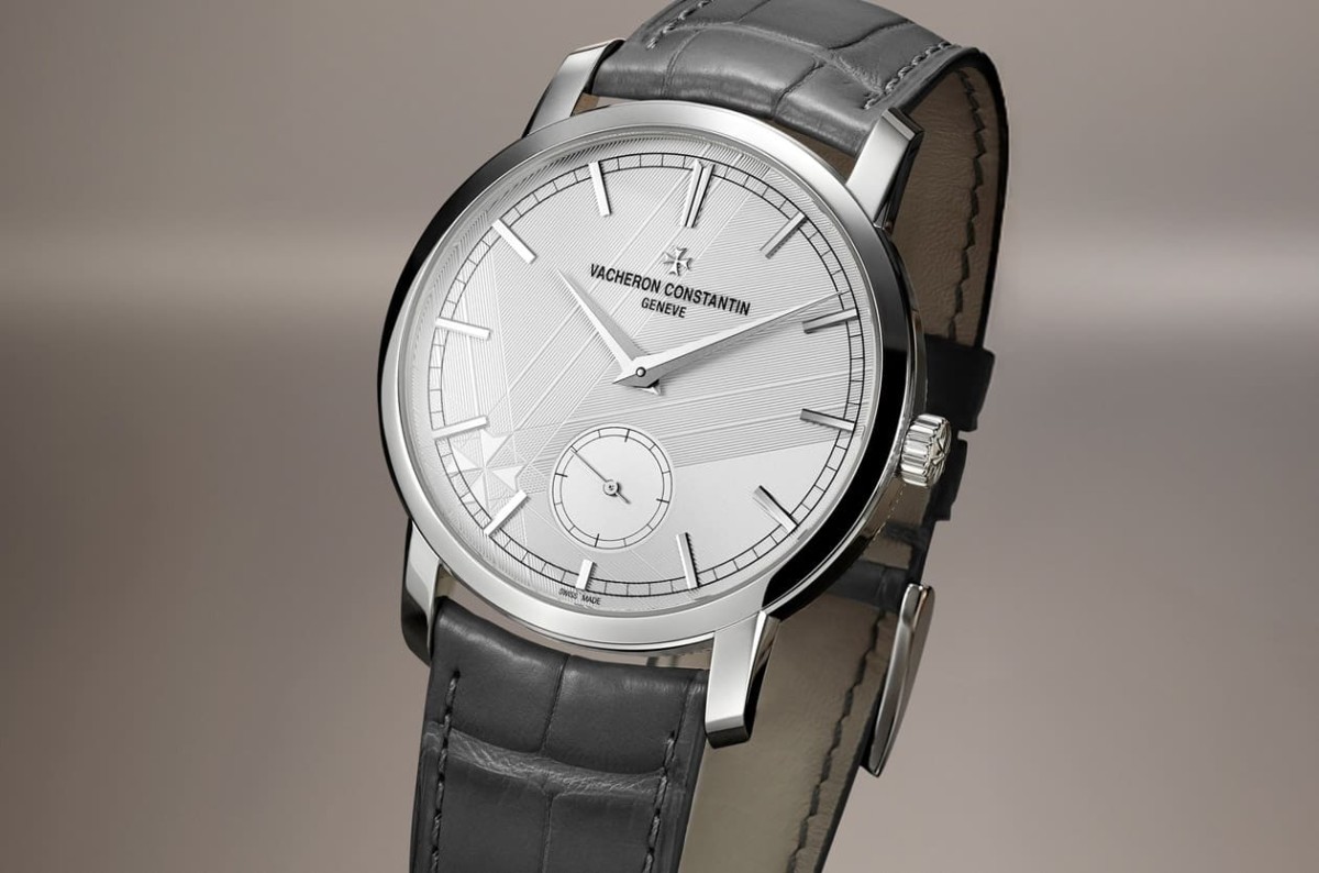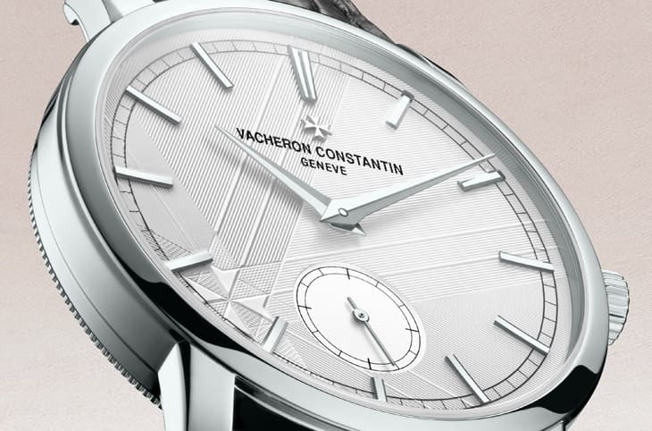 如果说Traditionnelle铂金款的灵魂藏在机芯,那麼它的气质则全写在独特的银灰面盘上。远看它似乎只是简约乾净;但只要稍微转动手腕、变换光线角度,潜藏其中的马耳他十字几何纹路便悄然现身,这些图案不是传统机刻雕花,而是透过精密冲压技术压制而成,整片面盘表面结合了巴黎钉纹、放射状条纹与平面装饰,层次感极强。江诗丹顿刻意将马耳他十字标志放在7点半钟方向,打破对称,却在不经意中增添设计张力。面盘上还可见太子妃式指针与立体金属时标,整体读时清晰而典雅,这组指针特别採用一半拋光、一半磨砂的处理,捕光角度不同、视觉表现丰富,就连六点钟的小秒针盘也毫不马虎,採用凹面设计与同心纹饰,呈现出一种内敛的层次美感。