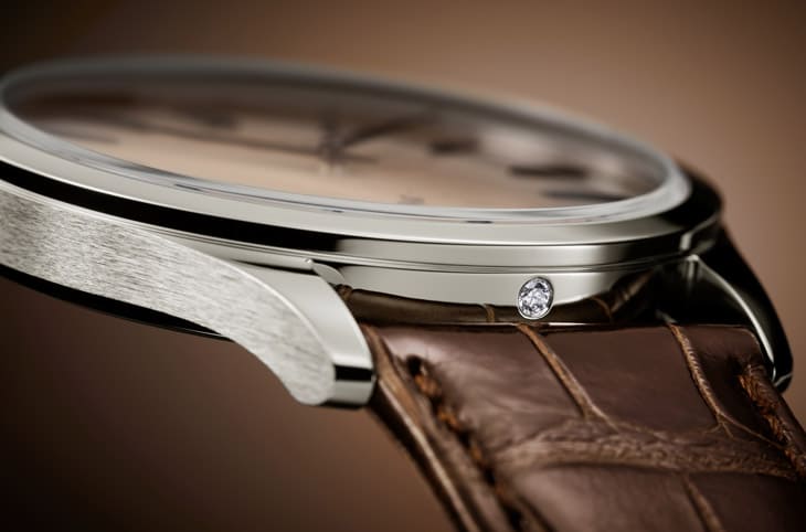 ▲38mm铂金表壳,比例精致优雅,其结合拋光与拉丝工艺,搭配代表性钻石装饰与透明底盖,展现经典与现代并存的细节美学。