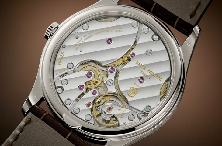 手表搭载的是百达翡丽专为此系列重新设计的手上链机芯:30-255 PS,这枚机芯的直径为31mm,刚好填满38mm表壳的底部空间,透过蓝宝石底盖可一览无遗。视觉效果上,它有着饱满的桥板布局与均衡的组件比例,让人从背面就能感受到它的力量与秩序。30-255 PS机芯厚度仅2.55mm,与上一代215机芯相同,但结构上却更为现代化。特别值得一提的是,它採用了双发条盒设计,在不增加厚度的情况下,动力储存提升至65小时,明显优于旧作的44小时。承前所述,机芯的装饰方面则完全不负百达翡丽之名,举凡日内瓦波纹、鱼鳞打磨、拋光倒角样样俱全,零件每一道边缘都处理得毫不含糊,哪怕是最内侧的螺丝槽,也能看到打磨痕跡,种种细节让真正懂表的人,从裡到外都能感受到诚意。