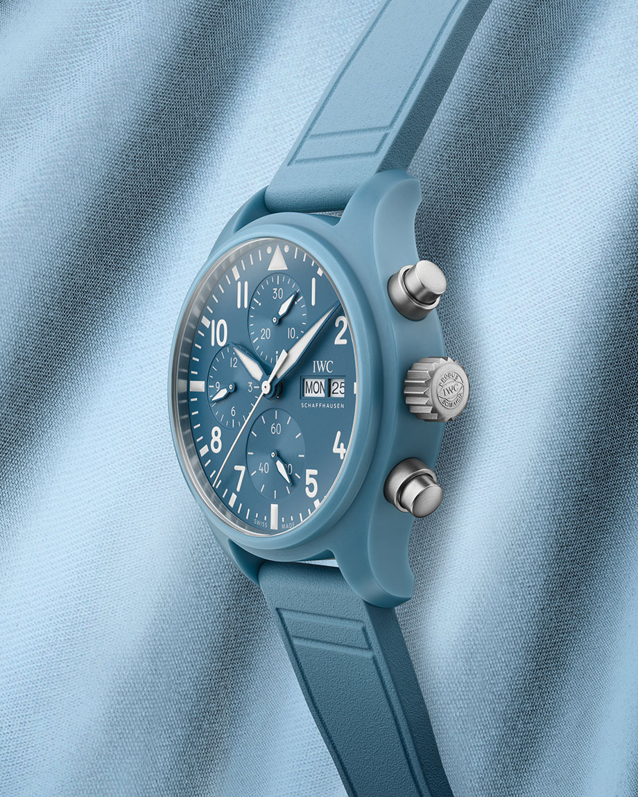 飞行员系列 TOP GUN 海军空战部队计时腕表 41「Miramar」特别版(型号 IW389409)限量发行 1,000 枚,採用浅蓝色陶瓷表壳,搭配同色系表盘及防水橡胶表带。蓝色指针覆以 Super-LumiNova® 夜光涂层,即使在弱光环境下也能清晰读时。