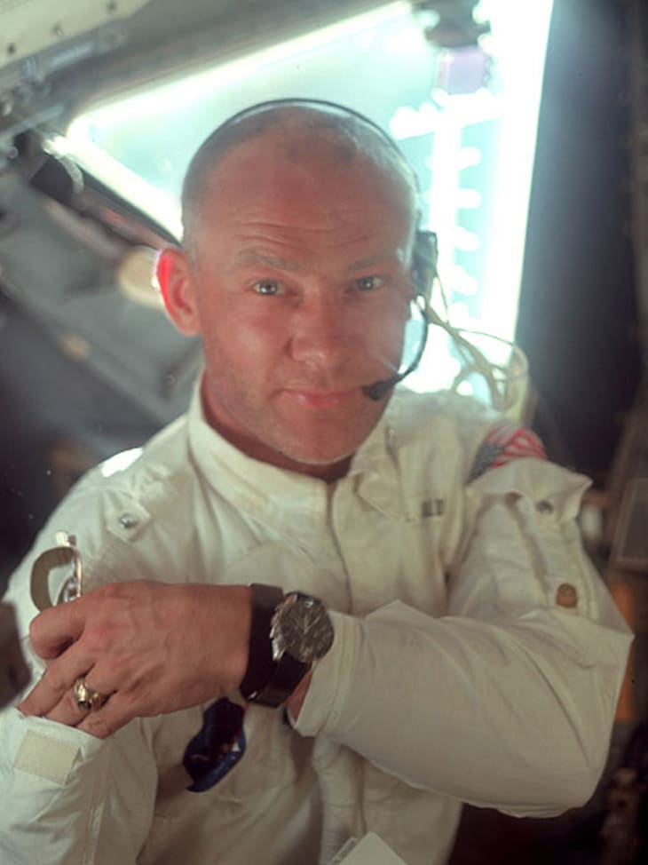 ▲1969年登月任务中,Buzz Aldrin佩戴欧米茄超霸表踏上月球,其手表在官方照片中清晰可见,超霸也因此成为首只登月的手表。