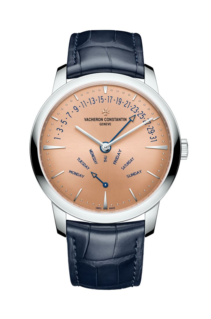 若想寻找一款有「话题性」的Patrimony,那麼这款铂金表壳搭配鮭鱼色面盘的逆跳星期/日期手表会是绝佳选择。它搭载2460 R31R7/3机芯,具备双逆跳显示的复杂功能,设计既经典又新潮,整体氛围偏向成熟稳重,但绝不老气,是资深藏家眼中的亮点。