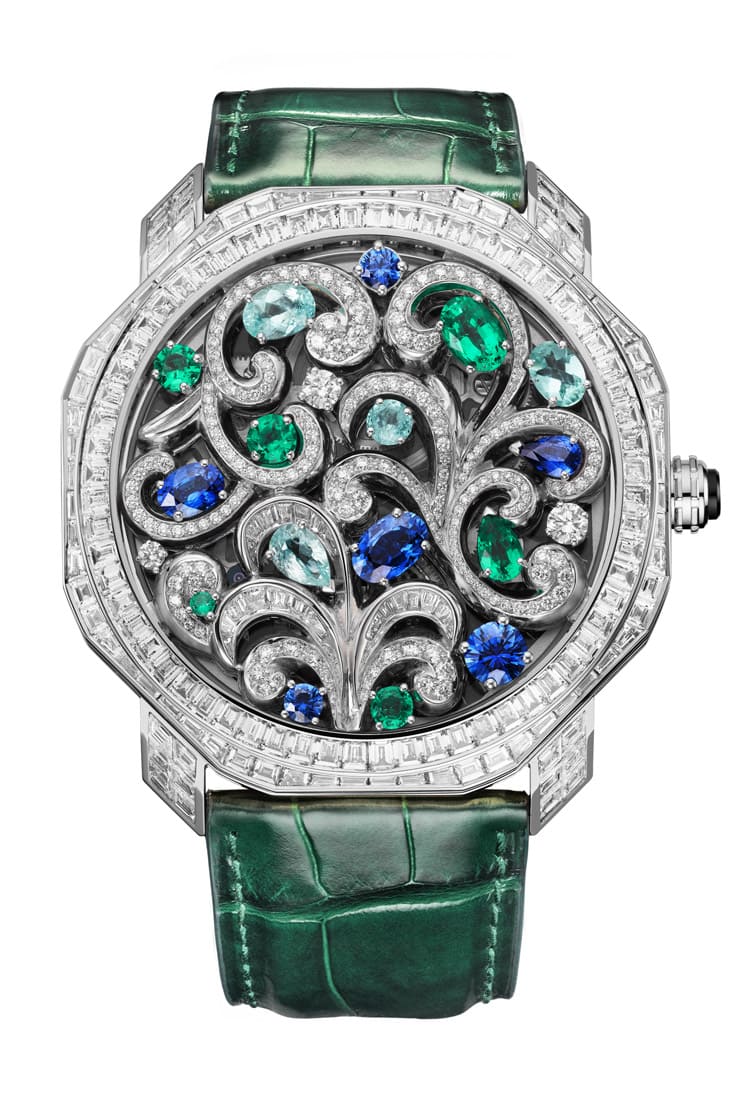 18K白金材质/BVL 191自动上链机芯/时、分显示/表款镶钻/面盘镶长棍形切割蓝色和粉红色蓝宝石、圆形明亮切割钻石、圆形切割混合祖母绿、蛋白石/蓝宝石水晶镜面/防水30米/表径37mm/限量10只