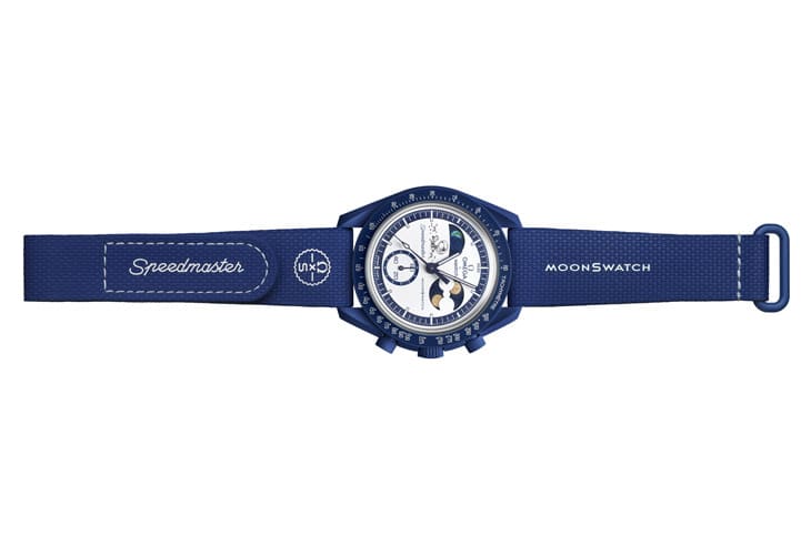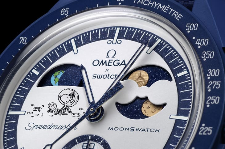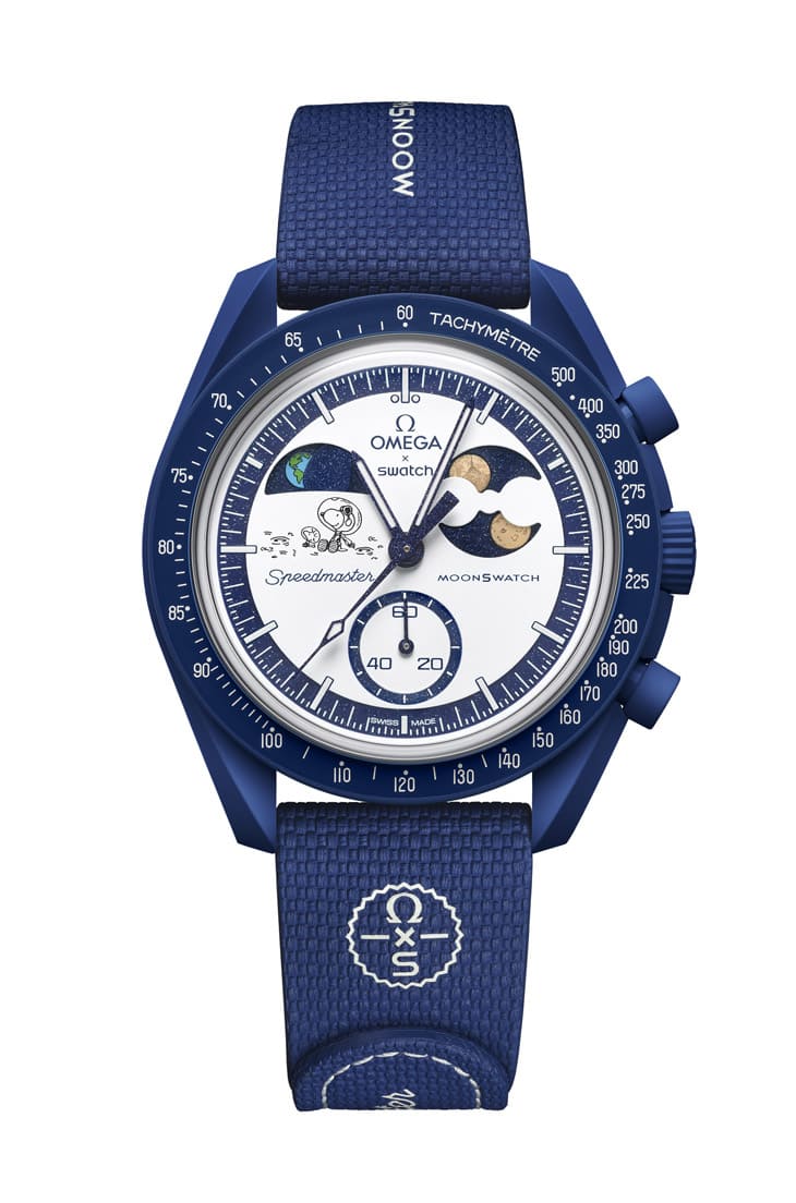 虽然搭载的是石英机芯,但功能配置诚意十足:计时、双月相(地相)、独立小秒盘,还有一连串有梗的设计桥段,表壳背面刻有任务宣言,电池盖则採用以地球为灵感的设计,OMEGA x SWATCH标志更是在面盘与表冠上同步现身,强化整体辨识度。