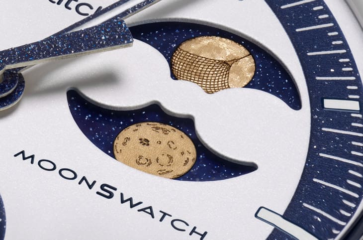MoonSwatch Mission to Earthphase的功能灵感来自传统月相显示,不同的是它呈现的是从月球望向地球的「地球盈亏变化」,每29.5天为一周期,旋转方向还与月相相反,地球图案以逆时针方向转动,这样的设计不只浪漫,更充满诗意与天文科学的结合感。