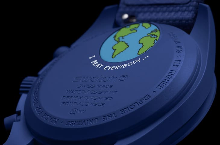 ▲背面刻有任务宣言,呼应探索主题,电池盖上的地球图案设计延续MoonSwatch行星系列美学。