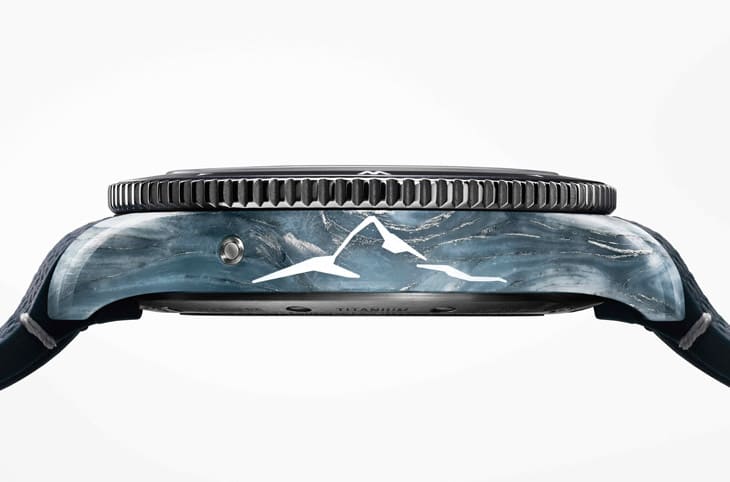 万宝龙在这款Geosphere文森峰限量版中用了两大特色材质:一是坚固又轻盈的钛金属表壳,另一是让人一看就想到极地冰原的创新复合中层表壳,这层蓝白交错、纹理独特的材质混合了石英纤维、镀铝玄武岩纤维与碳酸钙,再加上冰蓝色树脂,视觉效果绝对抢眼,仿佛南极洲历经千万年沉积的冰层。而「零氧技术」则是这款表最大的杀手鐧,意指整只表在组装时抽光内部氧气,达到真正密封状态,能有效避免起雾与机芯氧化,非常适合在高海拔、气压急遽变化的环境下佩戴,加上43.5mm的适中尺寸与双向旋转表圈、滚花设计与蓝色Super-LumiNova夜光点缀,不管是日用还是户外冒险,这只表都能稳稳扛住。别忘了,表壳左侧还隐藏了小惊喜:文森峰轮廓的发光浮雕,白天是白色,夜晚则转为冰蓝,简直像南极的永夜景象在腕间流转。
