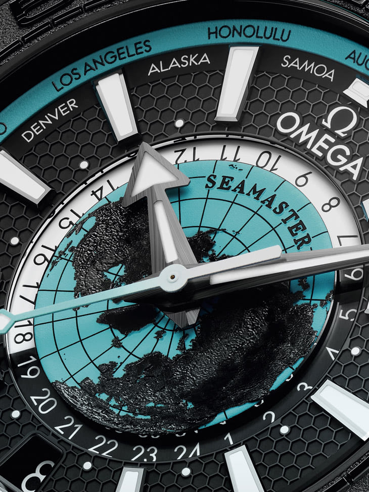 欧米茄选择使用五级钛金属打造面盘中心圆盘,并透过雷射雕刻出从北极视角俯瞰全球的大地图,地图外圈是一个旋转的24小时刻度环,分成黑白区域标示昼夜时间,操作上简单直觉,实用度高。而在这个版本中,绿松石色的海洋成为最吸睛的点缀,黑色面盘与绿松石蓝形成强烈对比,不只展现设计美感,也提升整体辨识度。外围城市环以黑色DLC黄铜材质打造,表面刻有蜂巢纹理,质感与细节都让人印象深刻。佩戴者甚至能在城市列表中找到Bienne(欧米茄总部所在地),为品牌精神添上一笔。指针部分也相当讲究,使用黑色PVD涂层与拉丝处理,内部填充白色Super-LumiNova夜光涂料,夜晚下,时、分针和时标会发出淡蓝色光芒,秒针则是醒目的渐层绿松石色,一眼就能看出时间。这样的配色让人联想到极地冰川与深海之间的神祕边界,既现代又带有探险气息。