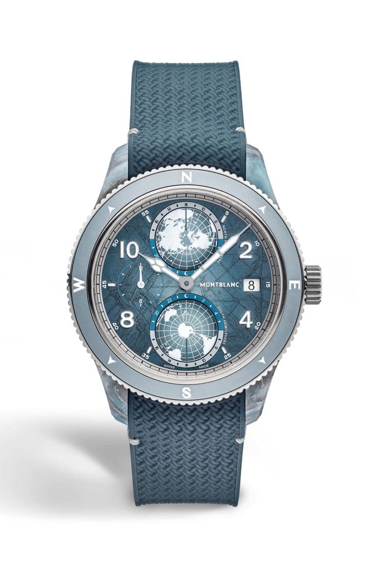钛金属、蓝绿色复合材质/MB 29.25自动上链机芯/时、分、日期显示/南北半球旋转地球仪世界时区显示/两地时间显示/蓝宝石水晶镜面/防水100米/表径43.5mm/限量986只/参考价:NT$ 313,200