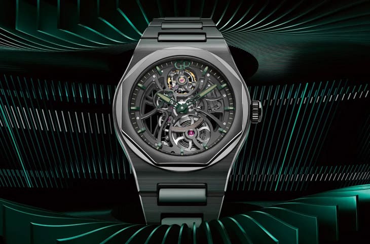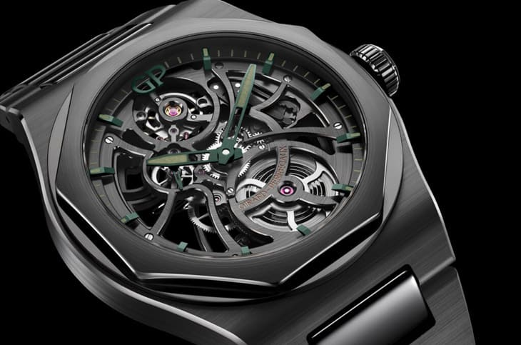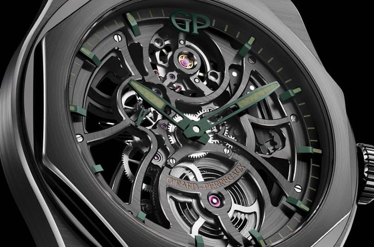 ▲镂空设计完整展现GP01800机芯结构,赛车绿指针与夜光时标浮现机械层次,小秒针与黑PVD桥板强化视觉节奏,尽显赛道美学。