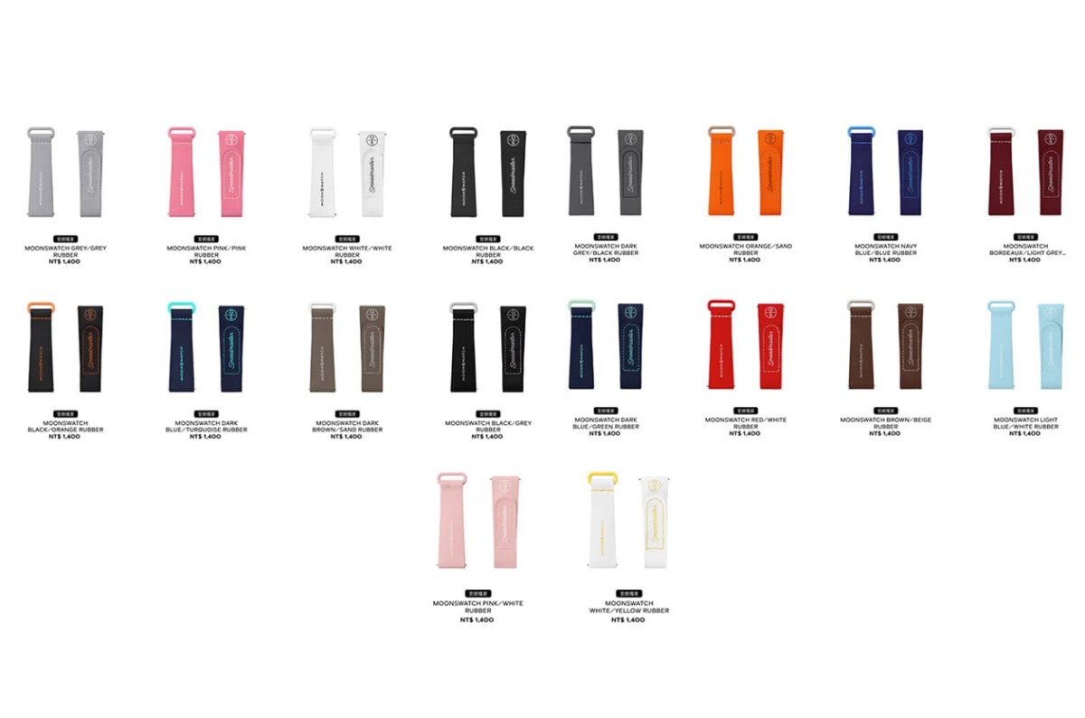 橡胶材质/18种顏色/正面饰有与太空服相似的布料纹理、背面则压印着如月球表面陨石坑般的凹凸纹路/含表带快拆系统/尺寸XS:13-14.5cm、S:14.5-16cm、M: 15.5~17cm、L:17-19cm、XL:18-20.5cm/SWATCH官网限定贩售/参考价:NT$ 1,400