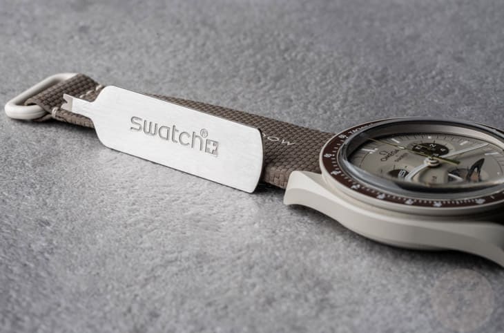 这次新出的橡胶表带,质感可说是从裡到外全面升级,正面带有模仿太空服布料的细腻纹理,背面则压印月球陨石坑般的立体凹凸,呼应了MoonSwatch的太空故事。结构上分成两段,短段有耐用的Bioceramic表环、长段配备贴合度极佳的VELCRO®魔鬼毡,特别的是,魔鬼毡的贴片藏在凹槽内,所以不太会刮皮肤,细节非常到位。快拆系统是另一大亮点,标准MoonSwatch的表带没有这个功能,现在还随附工具让表主可以轻松更换,更贴心的是,新款改成两段等长(长段粘贴后),这让魔鬼毡黏合更服贴,解决了旧款「鼓鼓的」问题。不论是OMEGA X SWATCH标志、MoonSwatch标志,还是Speedmaster的经典标记,都清楚压印在表带上,戴出去就是原厂正统,辨识度满分。