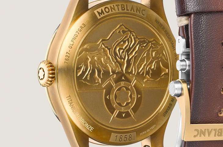 ▲不锈钢底盖经铜铝PVD处理,鐫刻白朗峰、罗盘与冰斧图案,内部搭载MB 24.17自动机芯,基于Sellita SW200-1,无氧封装确保长期稳定与精准。