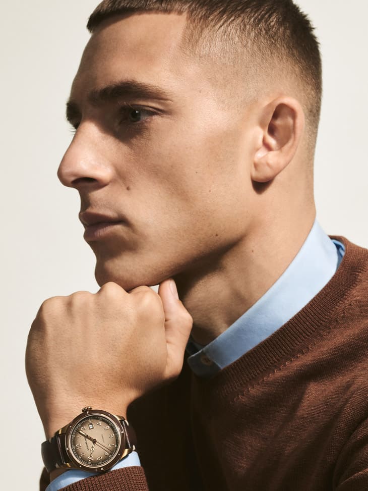 ▲1858零氧自动日期表採用铜铝合金表壳,坚韧耐蚀,并会随时间产生独特色泽,其零氧技术防雾有助于抗氧化,搭配拋光棕色陶瓷表圈与100米防水,兼具耐用与探险风格。