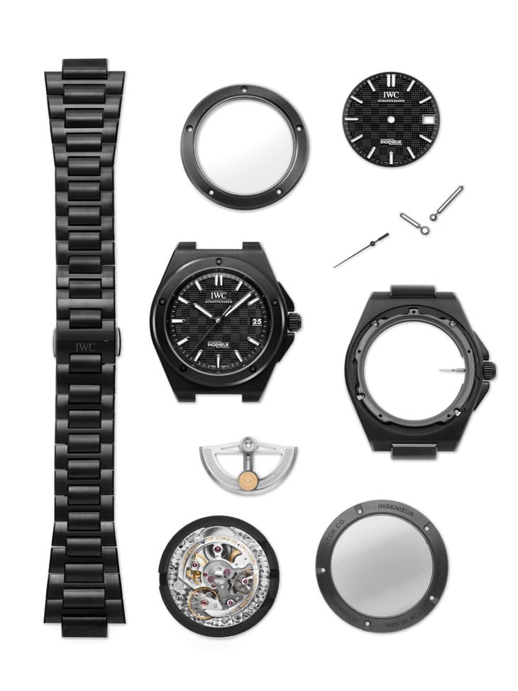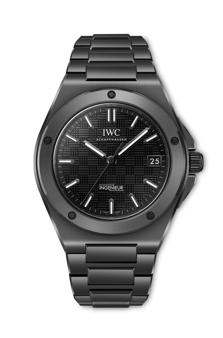 拿起这只工程师自动表,你很快就会发现它跟传统金属表的「手感」完全不同,表壳、表圈、表背环、表冠护肩,甚至表冠本身,全都由黑色氧化鋯陶瓷打造,这种材质的维氏硬度高达1300,只有钻石工具才能加工,耐刮又不易变色,实用性与质感并重。42mm直径比系列经典40mm版本稍大,但由于全黑的收敛效果,实际上戴在手上并不突兀。IWC依然保留了三件式表壳结构,透过内部钛金属环固定表圈与表背螺丝,确保防水达100米,同时让陶瓷零件维持精准的比例与角度。链带的整合式H形链节同样採陶瓷制作,重量轻、佩戴时不受温度影响,夏天不烫、冬天不冰,表面还经过缎面打磨后再喷砂,触感细腻,边缘再以拋光处理,让不同光线下的黑色展现细腻的光影变化。这种全黑设计,既保有 Gérald Genta原作经典线条,也透过材质升级,让它看起来像是一件高科技护甲,低调却充满存在感。