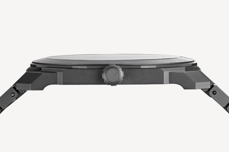 宝格丽用黑色雾面陶瓷做了手表的表壳、表冠、面盘和整合式链带,从裡到外都是同一种触感与色泽,这种陶瓷能吸收光线,让它在视觉上像融入背景一样,展现「隐形」的特质。表壳直径40mm,厚度仅5.50mm,这在全陶瓷结构中几乎是不可思议的数字,毕竟陶瓷虽硬,却也很脆,不是那麼好雕出这麼精细纤薄的造型。八角形多层次结构是Octo系列的标志,边线俐落而且层次丰富,让它虽薄却不单薄。链带由灵活的链节组成,和表壳无缝相接,佩戴起来像是一件贴合手腕的饰品,它的轻盈特性加上陶瓷温润的触感,让人戴上一整天也不会有压迫感,这种全陶瓷的存在,在钛金属与不锈钢版本中显得格外特立独行,像是用材质把它划进另一个层级。