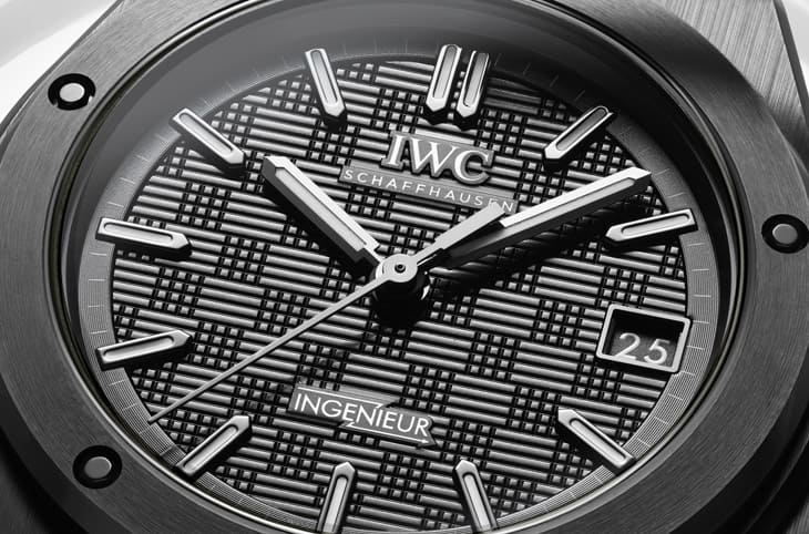 Ingenieur系列深植人心的「网格」纹理面盘被完整保留,这种由细线与方格交错的结构,赋予面盘浓厚的工业感与立体层次。黑色是主旋律,但它不是单调的纯黑,而是透过纹理与材质反射,呈现多层次的深邃感。指针与立体时标同样採黑色调处理,并涂覆Super-LumiNova®夜光涂层,在昏暗环境下依然清晰易读。三点钟方向的日期窗做了贴心的黑底白字处理,既不破坏整体配色,又确保日常阅读方便。有趣的是,这种「全黑」设计反而让细节更突出,例如纹理的阴影变化、指针边缘的反光、时标上的夜光层,这些原本可能被忽略的部分,反而因为色彩的节制而被放大,它不用炫目的色彩抓住目光,而是让人越看越觉得「这黑色不简单」。
