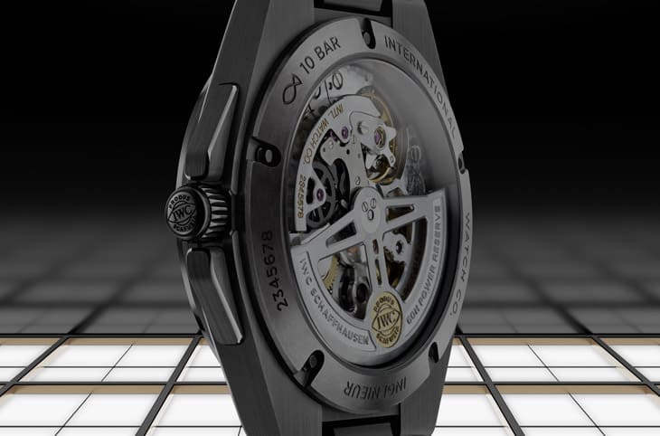 手表搭载82110自动机芯,它採用着名的比勒顿上链系统(啄木鸟系统),能有效捕捉自动盘在双向运动中的能量,带来60小时的动力。耐用性方面,IWC把高压运作的关键部件换成陶瓷材质,像是自动轮与棘爪用黑色陶瓷、自动盘轴承则用白色陶瓷,这些部件几乎不会磨损,大幅延长了机芯的寿命,也减少了保养频率。机芯震频为4Hz,配有22颗红宝石,走时精准稳定。透过略带色泽的蓝宝石透明底盖,你能欣赏到这枚机芯的精致修饰,打磨与倒角处理在光线下展现细腻光泽,更重要的是,这种视觉上的黑色力量,从外壳一路延伸到内部,让你觉得这枚机芯就像是全黑装甲下的心臟:安静、强壮,随时待命。