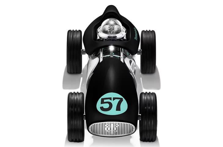 Time for Speed时钟黑色版是对高速赛车与精密制表的双重致敬,黑色烤漆车身线条俐落,光泽中带着力量感,彷彿一辆蓄势待发的赛车,虽然色彩转向沉稳,但细节仍处处呼应品牌传承:车头引擎盖上那枚TIFFANY Blue 57标志,不仅点亮了整体视觉,也暗藏向纽约第五十七街旗舰店的致敬,让这件作品与品牌根基紧密相连。