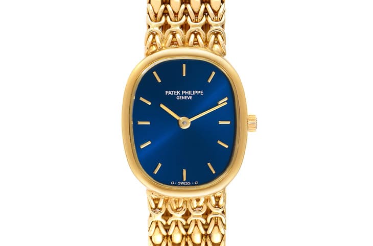 ▲这款约1993年制作的百达翡丽老表,以黄金比例的椭圆形表壳、蓝色太阳放射纹面盘与手工雕花黄金链带闻名,搭载石英机芯,展现优雅与经典品味。Source:SwissWatchExpo