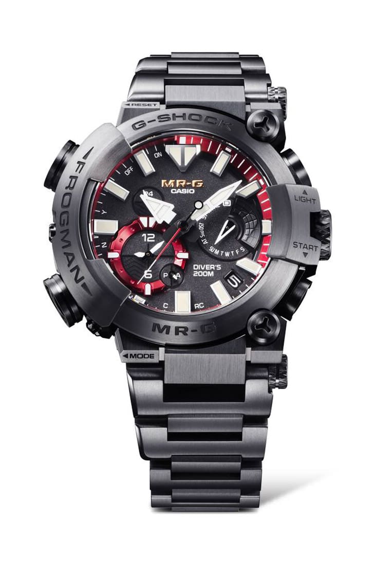 说到G-SHOCK的专业潜水系列,蛙人(FROGMAN)无人不晓。MR-G版本的MRG-BF1000延续不对称表壳设计,却以超过70枚零件重新打造,部件之间嵌入了用于确保密封性的O形环和缓冲体,兼顾200米潜水性能与高端打磨。功能上提供潮汐图与潜水模式,背盖还镶蓝宝石水晶玻璃,内部天线收讯不受干扰。像MRG-BF1000B-1AJR这款,是目前MRG-BF1000系列中唯一採用金属链带的表款,以黑红配色展现强悍气场,底盖的蓝宝石水晶玻璃上施加了主题色红色蒸镀处理,中央刻有蛙人系列的标志性青蛙图案,极具辨识度。