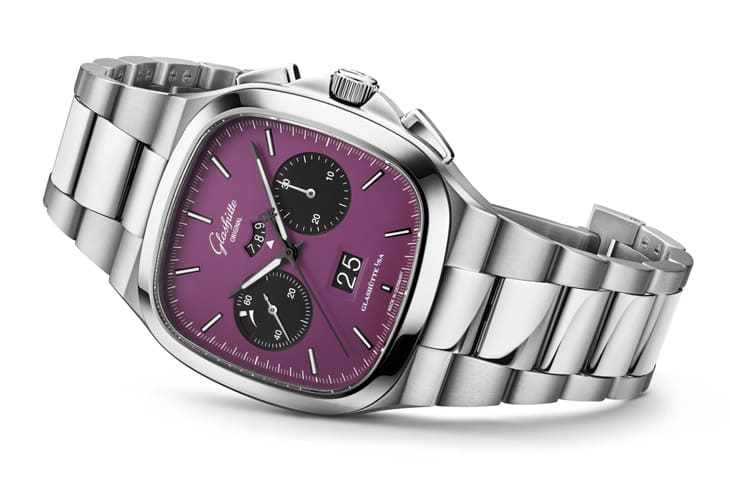 刚好格拉苏蒂原创在2025年夏季正式启用自家全新面盘厂,这两款新作正是出自那座专属工坊,雾面质感的漆面处理使得高彩度的紫与绿不显浮夸,反而更添低调的优雅,配上两枚电镀黑的小表盘,上头还带有「黑胶唱片纹」的细节,既复古又具现代张力。
