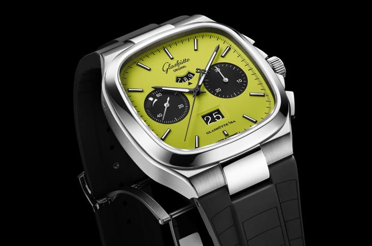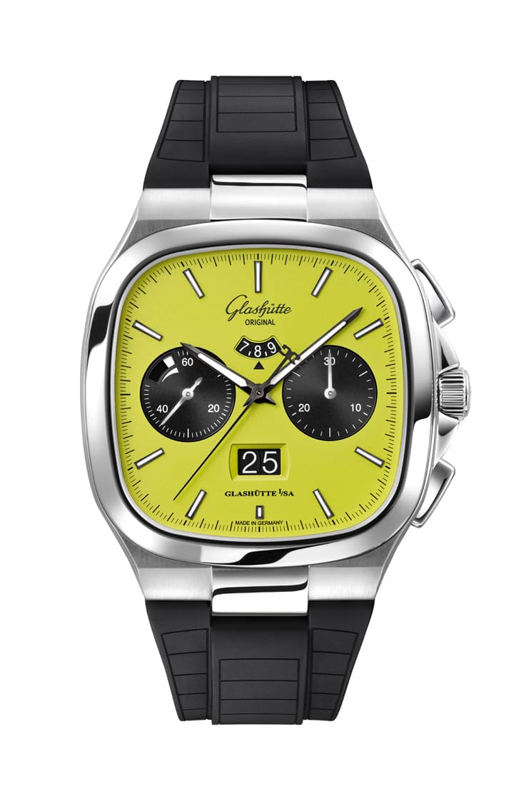外观方面,Seventies系列的经典40mm不锈钢表壳延续了方中带圆的轮廓,这种几何比例来自1970年代的未来主义设计,如今看来依然前卫。表壳经过拋光与缎面交错处理,让金属表面既有建筑感的锐利线条,又保留了触感上的柔和光泽,表冠两侧的护肩让整体更加坚固,并确保手表拥有100米防水性能,对一只计时码表而言相当实用。格拉苏蒂原创分别提供黑色雾面橡胶表带与带微调的不锈钢链带,让佩戴者能在同中求异的风格中做出最适合自己的选择。