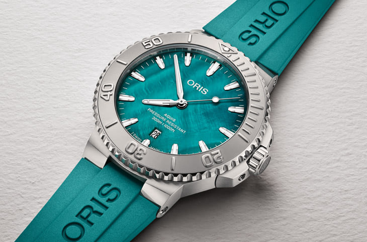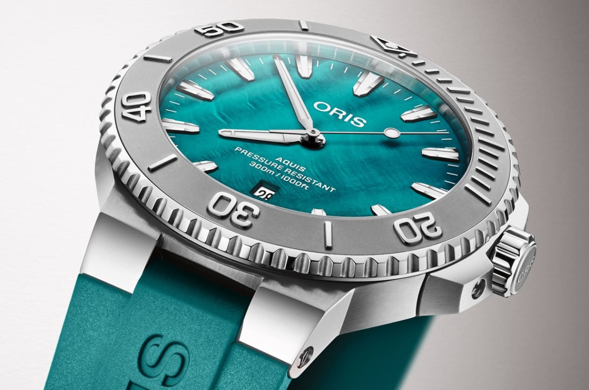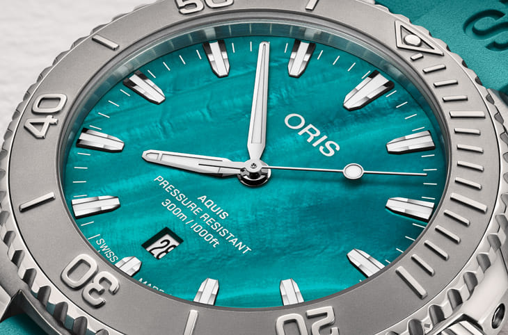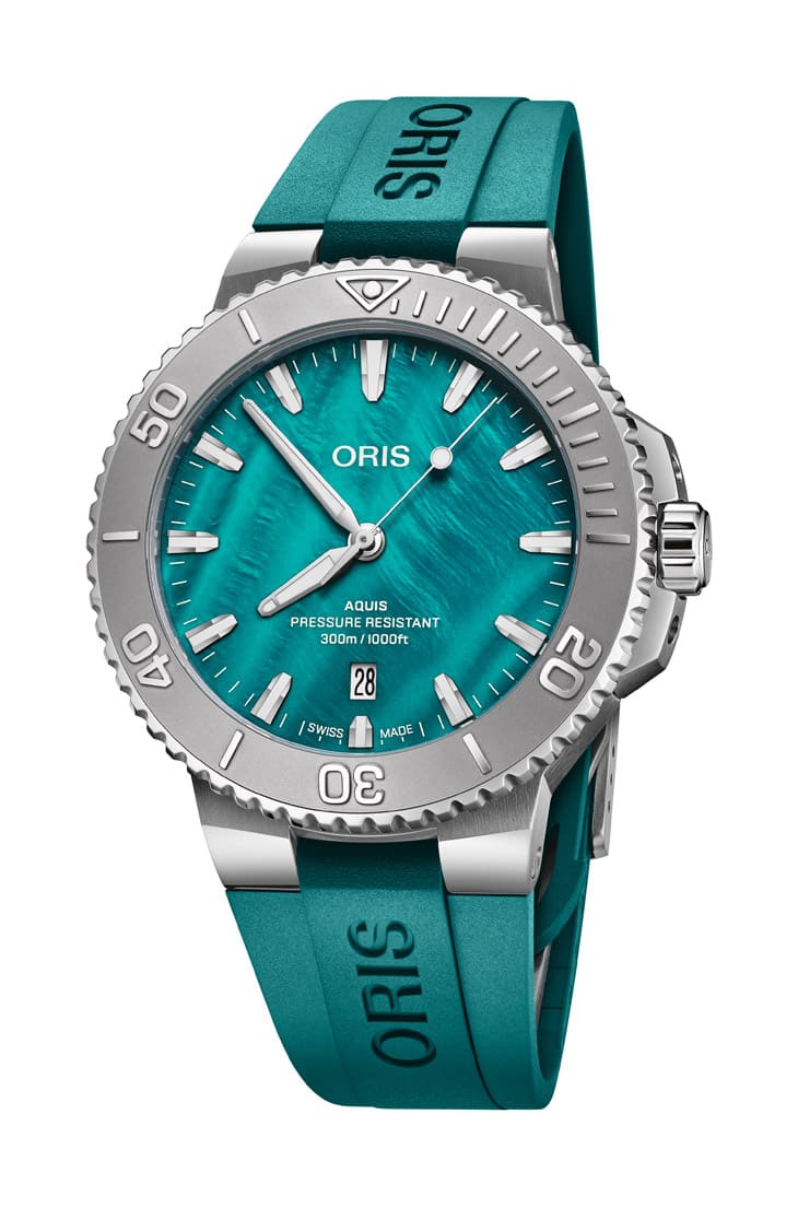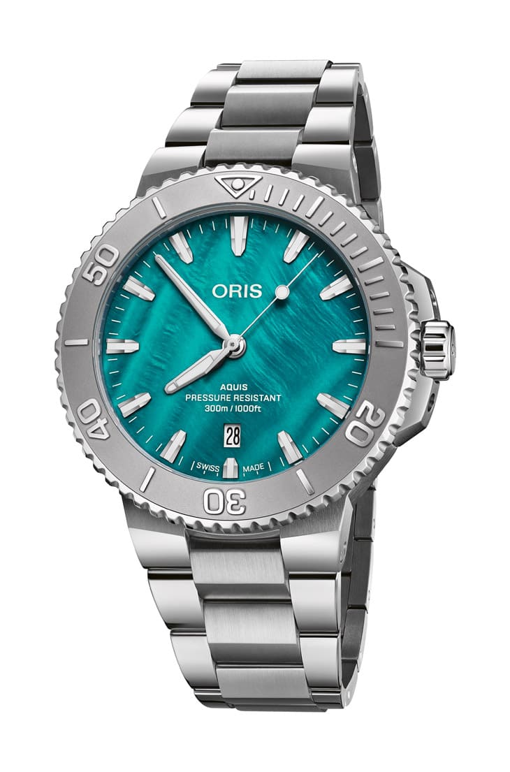 这只表最吸睛的地方,无疑是面盘。ORIS选用珍珠母贝材质,呈现独特的「海洋绿」色泽,这种色调既有水蓝的清新,也透出牡蠣壳的自然纹理,呼应计画中水质净化的意象,面盘上盾形时标与指针均覆以Super-LumiNova®夜光涂层,在黑暗环境中依然清晰易读;6点钟方向的日期窗设计简洁,保持视觉平衡,覆盖其上的蓝宝石水晶经过内层防反光处理,带来良好清晰度与保护力。