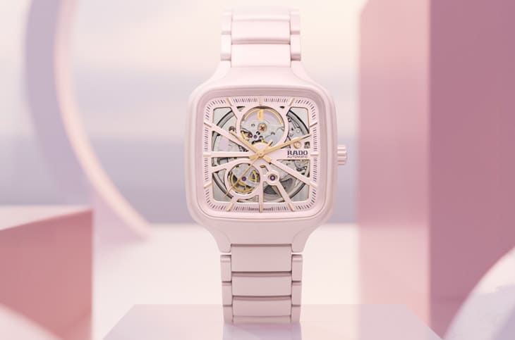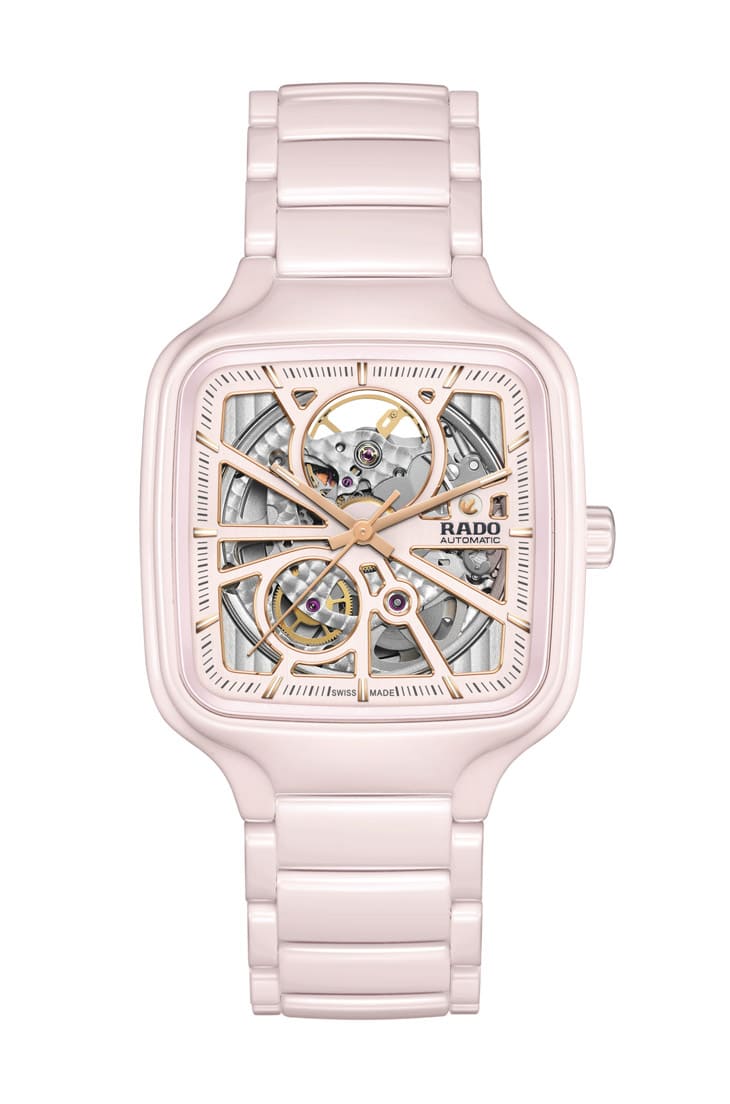 至于与Captain Cook的复古与冒险氛围相对,True Square真我方形系列则展现另一种爱情语言:纯粹与坦然。新作包含两款风格鲜明的陶瓷表,一款是柔美的玫瑰粉高科技陶瓷,另一款则为散发金属光泽的拋光电浆陶瓷。