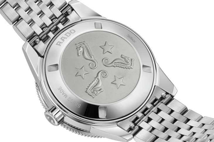 ▲旋入式不锈钢底盖鐫刻三只海马与星辰,既象徵品牌潜水传承,也强化300米防水性能,细节中流露对海洋探险精神的致敬。