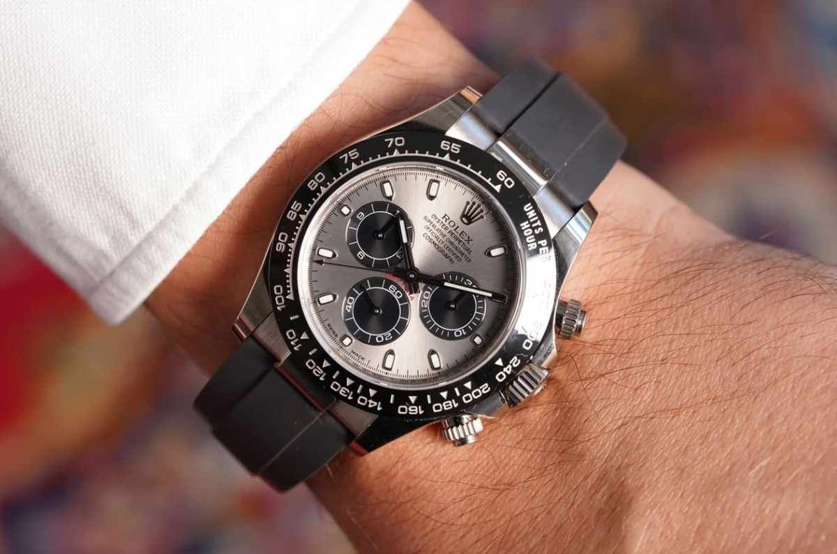 幸好,劳力士并没有就此忽视这个问题不理,2019年,白金Yacht-Master 42首次搭载了内建Glidelock延展系统的新型表扣,后来逐步应用到Daytona等热门款。这个看似与传统Oysterlock无异的表扣,实则提供了12至15mm的滑动调整范围,当Easylink被替换为Glidelock后,Oysterflex橡胶表带终于迎来质的飞跃。有亲身体验过新款Daytona胶带款的表主,若与旧版型号如116518相比,会有「天壤之别」的感受。无论是在会议室裡随着冷气强度微调,还是健身时放松一格,手表都能贴合得恰到好处,当佩戴者不再意识到表带强烈的存在时,才真正体验到手表与生活融为一体的境界。