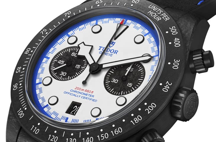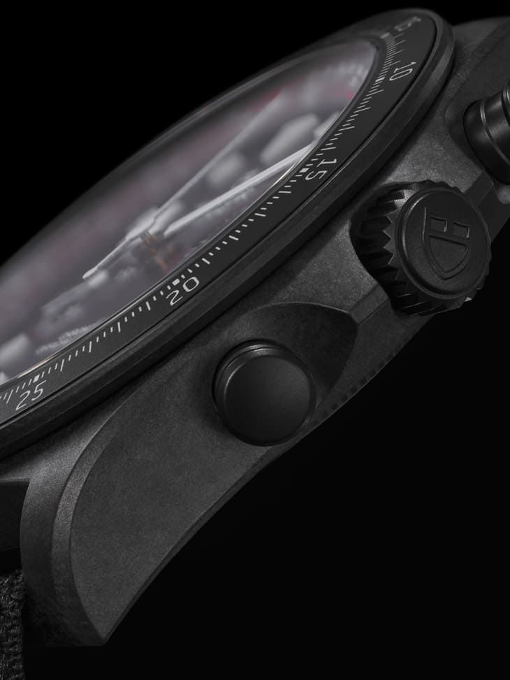 这只"Carbon 25"最核心的亮点,就是它那个碳纤维表壳,不同于之前帝舵在Pelagos FXD用过的碳复合材质,这次是以熔融碳纤维片制成,表面呈现细微的渐层纹理,看起来比传统碳纤维更低调、也更细致,有点介于陶瓷和碳纤维之间的质感。这种材质选择,不只是一种美学上的突破,还带来非常直观的佩戴体验:轻!比你想像中的42mm计时表轻得多。细看设计,你会发现帝舵这次在细节上下了很多功夫,像是表冠、计时按把和底盖,全都换上了黑色PVD处理的钛金属,重量更轻,也提升耐用性;固定表圈则是碳纤维材质,还内建测速刻度,让它彻底和赛车文化连结在一起,再加上碳纤维制的表耳盖,整体设计一气呵成,把轻量化这个概念发挥到极致。