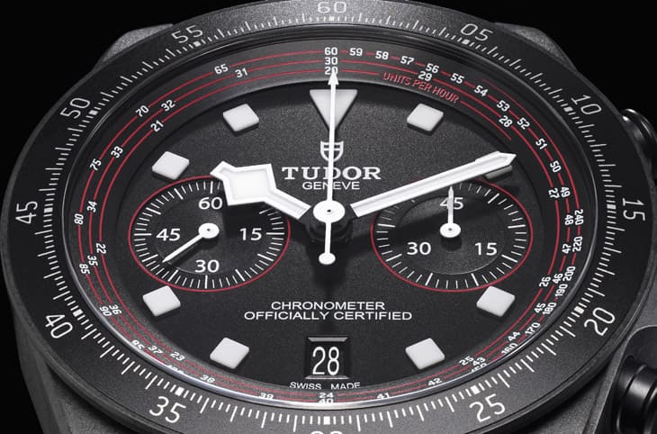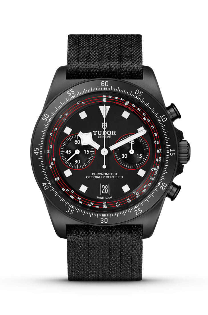 ▲雾黑面盘融入红色点缀,搭配夜光「雪花」指针与方形时标,帝舵更特制自行车测速计环绕面盘,6点设黑色日期窗强化实用性。