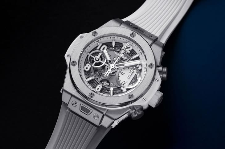 ▲这款表以42mm钛金属表壳搭配白色橡胶表带,搭载UNICO自制飞返计时机芯,设计纯净俐落,融合轻盈与坚韧,象徵中性美学新趋势。